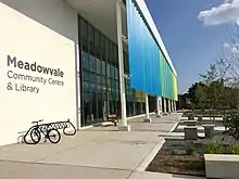 While the Township had many settlements within it, none of the hamlets were legally existent, and all residents were represented by a singular Township council (Malton had special status as a police village, allowing it partial autonomy). To reflect the community's shift away from rural to urban, council desired conversion into a town, and in 1965 a call for public input on naming it received thousands of letters offering hundreds of different suggestions.[26] "Mississauga" was chosen by plebiscite over "Sheridan", and in 1968 the reincorporation went forward, absorbing Malton in the process. Port Credit and Streetsville remained separate, uninterested in ceding their autonomy or being taxed to the needs of a growing municipality. Political will, as well as a belief that a larger city would be a hegemony in Peel County, kept Port Credit and Streetsville as independent enclaves within the Town of Mississauga, but both were amalgamated into Mississauga when it reincorporated as a city in 1974. At this time, Mississauga annexed lands west of Winston Churchill Boulevard from Milton in the northwest,[27] in exchange for lands in the northernmost extremity (which included Churchville) south of Steeles Avenue which were transferred to Brampton.[28] That year, Square One Shopping Centre opened; it has since expanded several times.[29]