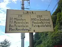 The Rosenheim–Kufstein railway (German: Bahnstrecke Rosenheim–Kufstein) is a 32 kilometre-long double-track main line of the German railways. It connects the Munich–Rosenheim and the Rosenheim–Salzburg lines at Rosenheim with the line to Innsbruck, thus connecting Germany, Salzburg and eastern Austria with Innsbruck and the Brenner line to Italy and the Arlberg line to far western Austria. The line is part of the Line 1 of Trans-European Transport Networks (TEN-T). It is electrified at 15 kV, 16.7 Hz.