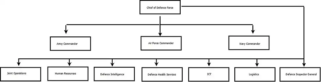 NDF ranks are based on the Commonwealth rank structure. There is no approved four-star general rank in the NDF. The Chief of Defence Force is a singular appointment that comes with an elevation to the rank of lieutenant general for an Army officer, air marshal for an Air Force officer and vice admiral for a Navy officer. Arms of services commanders i.e. Army, Air Force and Navy commanders, have a rank of major general, air vice marshal and rear admiral. The rank of brigadier has also been transformed into brigadier general. Directorate heads are always brigadier generals, i.e. the Chief of Staff for Defence Intelligence.