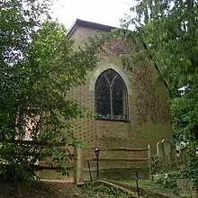 The former chapel is an example of the "simply-crafted", plain Unitarian chapels which were typically found in rural areas: "congregations of towns and more prosperous villages wanted something more appropriate", and many large, landmark chapels of advanced architectural quality were built in the 18th and 19th centuries in urban areas.[15] It is a small single-storey building of brick with a two-window range on the southeast-facing front, each with three wide Gothic-style lancets. Between these windows is an arched doorway with a datestone above showing the date 1810.[13][4][10][14] The brickwork is red and grey. On the rear (northwest-facing) wall there are two windows with timber frames, mullions and transoms. The mansard roof is tiled and half-hipped[4] and has also been described as a gambrel roof—an unusual feature for a chapel. [14]