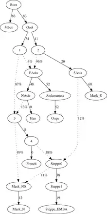 A study by Reich et al. (2009) found that while the Onge are distantly related to modern Indian people, they have none of the admixture from Neolithic Iranian farmers or steppe pastoralists which is widespread on the mainland. From this, they conclude that the Onge are solely descended from one of the ancient populations which contributed to the genetics of modern Indians.[29] According to Chaubey and Endicott (2013), overall, the Andamanese are more closely related to Southeast Asians and East Asians than they are to present-day South Asians.[30] according to Yelmen et al. 2019, certain South Indian tribal groups are a better proxy for Ancient Ancestral South Asian (AASI) ancestry than the Andamanese Onge are.[31]