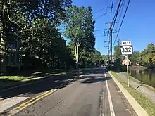 Upon intersecting Lindenhurst Road/Campus Drive north of the Newtown Campus of Holy Family University, the route enters Lower Makefield Township and becomes Newtown Yardley Road. The road passes through farmland before heading north of an office park and reaching a partial cloverleaf interchange with I-295. Following this interchange, PA 332 becomes a two-lane undivided road and intersects Mirror Lake Road before it enters residential areas and crosses Buck Creek. The route reaches a junction with Yardley Langhorne Road and turns northeast onto Afton Avenue. PA 332 enters the borough of Yardley, where it is known as West Afton Avenue. The road heads into the downtown area and crosses Main Street, where the road name changes to East Afton Avenue, and the Delaware Canal. PA 332 comes to its eastern terminus at an intersection with PA 32, which runs along the west bank of the Delaware River.[3][5]