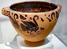 Early black-figure skyphos-krater, front side with swans, back with spiral ornaments and swans’ heads, ‘’circa’’ 630 BC; found at the Vourvas tumulus in Attica, National Museum, Athens.