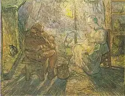 Like the painting First Steps, the painting Night or Evening: The Watch depicts happy life of a rural family: father, mother and child. Here the image seems bathed in yellow light like that of the Holy Family.[37] A lamp casts long shadows of many colors on the floor of the humble cottage. The painting includes soft shades of green and purple. The work was based on a print by Millet from his series, the four times of day.[38]