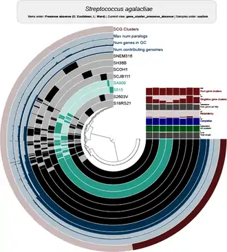 Pangenome analysis of genomes of Streptococcus agalactiae.[2] Example of phylogenies made with BPGA software. This software allows us to generate phylogenies based on the clustering of the core genome or pangenome. Core and pan phylogenetic reconstructions are not necessarily matching.