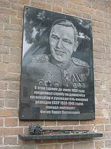 Fitin became deputy chief of the NKVD's foreign intelligence in 1938, then a year later at the age of thirty-one became chief, with the rank of Lieutenant General.[3] The Russian Foreign Intelligence Service credits Fitin with rebuilding the depleted foreign intelligence department after Stalin's Great Purge. Fitin also is credited with providing ample warning of the German invasion (Operation Barbarossa) of 22 June 1941 that began the German-Soviet War.[4] Only the actual invasion saved Fitin from execution for providing the head of the NKVD, Lavrentiy Beria, with information that the General Secretary of the CPSU, Joseph Stalin did not want to believe. Beria retained Fitin as chief of foreign intelligence until the war ended, but demoted him.