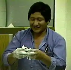 Nicario Jiménez Quispe (Quispe is his mother’s name) is a master artisan of the craft of making retablos. He was born in 1957 in a small highland Andean village near Ayacucho, and learned how to make retablos from his father and other skilled craftsmen. He has studied at the University of San Marcos in Lima, and has exhibited his retablos in Peru and abroad in several international competitions. His photo was taken while doing a demonstration at American University’s Language and Foreign Studies Department in 1991.