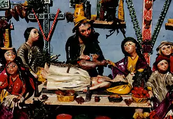 The use of wood for the outside box remained, but other materials, such as gypsum, clay, or a potato-gypsum-clay paste mix, were increasingly used for the figures because of their ease of handling and durability.