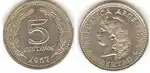 In 1881, silver 10, 20 and 50 centavos and 1 peso and gold 1 argentino coins were introduced, followed by bronze 1 and 2 centavos the next year. Silver coins ceased production in 1883, with gold coins ending in 1896. Base metal 5, 10 and 20 centavos were introduced in 1896, with base 50 centavos following in 1941. The 1 peso was reintroduced in 1957, with 5, 10 and 25 pesos introduced in 1961, 1962 and 1964.