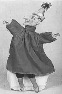 It was during this period that a young Fyodor Dostoevsky frequented puppet shows with his brother, attesting in his writings for the relationship between Petrushka and Pulcinella. In his diaries and in "Gospodin Prokharchin," he writes of Petrushka as a counterpart to "Pul'chinel," a companion who would take the stage as sidekick to the puppet whose antics would become his own. As others who came before and after him, Dostoevsky saw the Petrushka theatre as an exploration of Russian cultural identity.[13] By the 1880s, Petrushka was the hero of these comedies, the sole constant among the moving parts of other characters and scenes. His popularity grew to the point of anachronistic texts from later periods retroactively referring to puppet shows of previous centuries petrushka. This also accounts for the frequent mixing of surnames, such as when Nina Simonovich-Efimova refers to the Russian puppet as "Petroushka Guignol Pickelherring Punch," describing him as a puppet who fell in with a bad crowd (i.e. a joke about the influence of the French, English, and Italian puppets on Russian puppetry).[14]