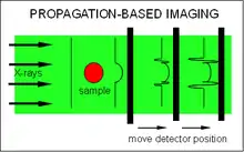 Propagation-based imaging (PBI) is the most common name for this technique but it is also called in-line holography, refraction-enhanced imaging[59] or phase-contrast radiography. The latter denomination derives from the fact that the experimental setup of this method is basically the same as in conventional radiography. It consists of an in-line arrangement of an X-ray source, the sample and an X-ray detector and no other optical elements are required. The only difference is that the detector is not placed immediately behind the sample, but in some distance, so the radiation refracted by the sample can interfere with the unchanged beam.[13] This simple setup and the low stability requirements provides a big advantage of this method over other methods discussed here.