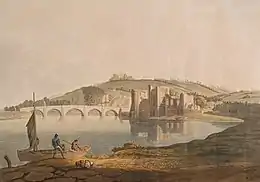 Newport in Monmouthshire (1813) by Edward Pugh, showing the castle, bridge and ships docked at Arthur's Pîl (or Town Pîl) beyond.