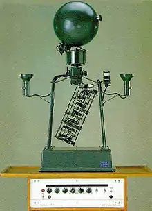 While this was being constructed, von Miller was also working at the Zeiss factory with German astronomer Max Wolf, director of the Landessternwarte Heidelberg-Königstuhl observatory of the University of Heidelberg, on a new and novel design, inspired by Wallace W. Atwood's work at the Chicago Academy of Sciences and by the ideas of Walther Bauersfeld and Rudolf Straubel[9] at Zeiss. The result was a planetarium design which would generate all the necessary movements of the stars and planets inside the optical projector, and would be mounted centrally in a room, projecting images onto the white surface of a hemisphere. In August 1923, the first (Model I) Zeiss planetarium projected images of the night sky onto the white plaster lining of a 16 m hemispherical concrete dome, erected on the roof of the Zeiss works. The first official public showing was at the Deutsches Museum in Munich on October 21, 1923.[10]