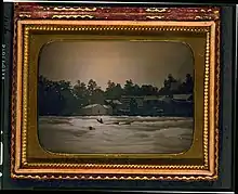 Babbitt photographed Joseph Avery on July 17, 1853 holding onto a log in the rapids above the falls. Avery was one of three men who lost their boat in the current. As the boat capsized, two of the men went over the falls and died, but Avery was able to hold on to a log pinned amongst rocks for 18 hours before succumbing after a series of failed rescue attempts.[3]