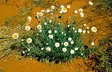 Polycalymma stuartii, the poached egg daisy, is an Australian daisy found abundantly on sand plains and dunefields.[2] Its common name is derived from the poached egg-like appearance of its white flower and yellow centre. It is the only known species of the genus Polycalymma; a member of the tribe Gnaphalieae within the family Asteraceae.[3][4][5] [6][7]