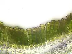The lamellae, ridges of cells that run along the leaf surface, are crenulate (i.e. with small rounded teeth) in profile and are 5 to 9 cells high. Their margins are distinctly grooved with 2 rows of paired, projecting knobs. The marginal cells, when observed in section, may be narrow, but are more typically enlarged and wider than those beneath. They are retuse (i.e. with a rounded apex with a central shallow notch) to deeply notched, and in rare cases are divided by a vertical partition. These cells are smooth and brownish in colour and have relatively thick cell walls. The sheath cells measure 60 to 90 µm long by 10 to 13 µm wide. These cells may be elongated rectangles or strongly linear structures up to 20 times long as wide. They become narrower toward the margins. Marginal lamina cells are 10 to 15 µm wide and are subquadrate (i.e. nearly square).[3]
