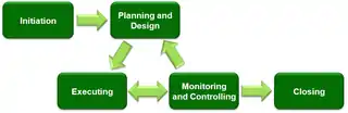 There are five phases to a project lifecycle; known as process groups. Each process group represents a series of inter-related processes to manage the work through a series of distinct steps to be completed. This type of project approach is often referred to as "traditional"[31] or "waterfall".[32] The five process groups are: