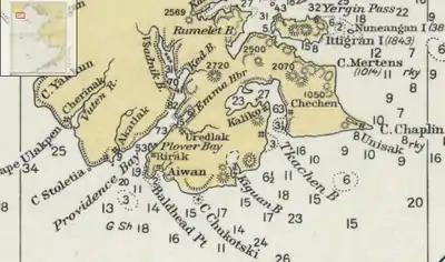 Plover Spit is site of an abandoned Eskimo village with characteristic semi-underground houses,[11] a more recent village of yarangas, and one of the 1869 eclipse observatories (see below).[12][13] The U.S. Coast and Geodetic Survey charts show the village at the base of the spit as Rirak, and starting in 1928 show a village Uredlak on the south shore of Emma Harbor[14] The Soviet-era village of Plover was probably located on the mainland near the spit; it was damaged by a landslide and the inhabitants (including some relocated from Ureliki) were relocated to Provideniya.[15] Nasskatulok, a Yupik village at the head of Plover Bay was reported by Aurel Krause (observed 1881) but not mentioned by Waldemar Bogoras (ca. 1898)[16] There were also villages on the coast. Aiwan (Avan), a Yupik village, lay east of the bay between the sea and Lake Istikhed (a freshwater lake named after the English toponym "East Head"; called Lake Moore in some English-language sources[17] ). It was reportedly abandoned in 1942 due to concern it could be hit by Soviet Navy shells; another source has it evacuated in 1941 to make way for coast-defense artillery; yet another source has it occupied into the 1950s.[18] The USCGS chart shows a village Akatlak just west of the mouth of the bay.