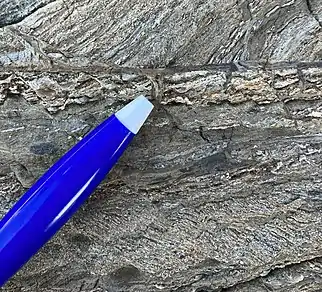 There is an apparent lack of pseudotachylyte in the geologic record relative to the observed seismicity of today,[24][25] which brings into question if this is an issue of the rarity of its production, lack of recognition in the field, or its ability to be preserved.[26] It was once thought that pseudotachylyte could only be produced in dry, crystalline rock,[13] this however, has been shown to be incorrect.[27] Therefore, its production is likely not as rare as originally thought. Pseudotachylyte is often closely associated with other extremely fine grained rocks (e.g. mylonite and cataclasite),[18] and is extremely prone to alteration that often renders it unrecognisable[24][25] which supports arguments that pseudotachylyte production isn't rare, but rather is likely to go unrecognised, and thus unreported.