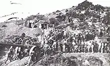 British forces in the Second Boer War were initially outgunned by the long range Boer artillery. Captain Percy Scott of HMS Terrible first improvised timber static siege mountings for two 4.7-inch (120 mm) guns from the Cape Town coastal defences, to counter the Boers' "Long Tom" gun during the Siege of Ladysmith in 1899–1900.[7] Captain Scott then improvised a travelling carriage for 4.7-inch guns removed from their usual static coastal or ship mountings to provide the army with a heavy field gun. These improvised carriages lacked recoil buffers and hence in action drag shoes and attachment of the carriage by cable to a strong point in front of the gun were necessary to control the recoil.[7] They were manned by Royal Navy crews and required up to 32 oxen to move.[7]