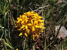 Quinchamalium chilense is a herbaceous, hemiparasitic, perennial plant with a rhizome, from which smaller rootlets with haustoria grow. From the rhizome a number of rarely-branching stems grow each year. These can be decumbent (creeping over the ground) or rise to over 2 metres in height. The flowers are produced in a cluster at the end of the stems, they are pentamerous and usually orangey-yellow in colour. It is extremely variable in height and flower size and colour, so much so that at one time 21 species were recognised, but in 2015 these were all reduced to synonymy with Q. chilense.[5][3] It is heterostylous;[5] some individuals bear 'thrum flowers', flowers which have short styles. This is somewhat correlated with elevation and cold. The leaves are also variable among individuals, they can be narrow or broader, the plants with more narrow leaves correlated with higher temperatures. The size of the plant appears correlated with annual precipitation.[4]
