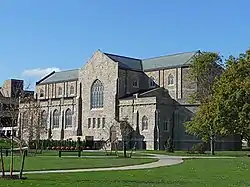 Another unique building is the Voorhees Computing Center (VCC). Originally the St. Joseph's Seminary chapel, it was built in 1933 and acquired by Rensselaer in 1958, and after renovation served as the institute's library from 1960 until the completion of the new Folsom Library, in 1976.[45] The Folsom Library, located adjacent to the computing center, has a concrete exterior that was designed to harmonize with the light gray brick of the chapel;[46] architecturally, it is an example of the modern brutalist style.[47] Subsequently, the university was unsure of what to do with the chapel, or whether to keep it at all, but in 1979 decided to preserve it and renovate it to house computer labs and facilities to support the institute's computing initiatives. Today the VCC serves as the backbone for the institute's data and telephony infrastructure.