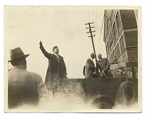 In 1936, Soderstrom threw his full support behind President Franklin D. Roosevelt. When polling showed Roosevelt losing Illinois to challenger the Alfred Landon 52% to 48%, he helped organize an unprecedented rally at the Chicago Stadium for Roosevelt that was later dubbed the "Meeting at the Madhouse."[18][19] While Roosevelt won Illinois, Soderstrom lost his re-election, a defeat generally attributed to his support for the Democratic president.[20] Though no longer a state representative, Soderstrom continued to serve as President of the ISFL and Illinois AFL-CIO.