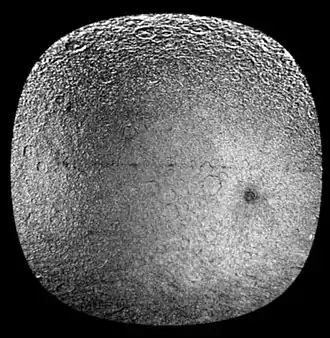 In November 2005 the Cassini orbiter found that Saturn's magnetosphere is depleted of energetic electrons near Rhea.[3] According to the discovery team, the pattern of depletion is best explained by assuming the electrons are absorbed by solid material in the form of an equatorial disk of particles perhaps several decimeters to approximately a meter in diameter and that contains several denser rings or arcs. Subsequent targeted optical searches of the putative ring plane from several angles by Cassini's narrow-angle camera failed to find any evidence of the expected ring material, and in August 2010 it was announced that Rhea was unlikely to have rings,[4] and that the reason for the depletion pattern, which is unique to Rhea, is unknown.[5][6] However, an equatorial chain of bluish marks on the Rhean surface suggests past impacts of deorbiting ring material and leaves the question unresolved.[7]