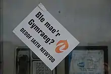 The Welsh-language pressure group Cymdeithas yr Iaith Gymraeg have been campaigning for a number of years with the Ble mae'r Gymraeg? (Where's the Welsh?) scheme, which campaigns for all road signs in Wales to display both Welsh and English information on public information signs. The campaign is most noted for its placement of stickers with the group's logo, a dragon's tongue, on signposts that are written only in English.
