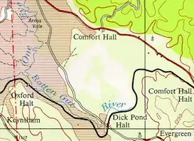 It is perhaps worth noting that the river is significant enough to cause the railway to follow just to the south of it as it makes its large loop to the south through Dick or Duck Pond hamlet.[1]