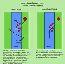 In bilaterian animals, including insects and mammals, most axons in the CNS cross the midline during nervous system development. The Robo proteins are critical regulators of midline crossing across species. In Drosophila embryos, Robo1 and Robo2 are required to keep ipsilaterally projecting axons from inappropriately crossing the midline, and to prevent contralateral axons from remaining stuck at the midline. Robo3, while it also binds Slit, does not appear to play a major role in regulating midline crossing. Instead, it is required for the lateral pathway selection of axons after crossing.[14] Robo2 also contributes to lateral pathway formation.