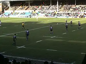 One of the main differences is the rules of possession.[25] When the ball goes into touch, possession in rugby union is contested through a line-out, while in rugby league a scrum restarts play. The lesser focus on contesting possession means that play focuses more on powerful running, hard tackling, forward progression and the contest for field position (commonly compared to an "arm wrestle"); as a result play stops much less frequently in rugby league,[26] with the ball typically in play for 50 out of the 80 minutes compared to around 35 minutes for professional rugby union.[27] Other differences include that there are fewer players in rugby league (13 compared to 15)[28][29] and different rules for tackling. Rugby union has more detailed rules than rugby league[30][31] and has changed less since the 1895 schism.[32]