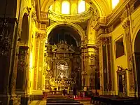 In 1699, construction of a church began using designs by Dionisio Lazzari, a second cupola was added by Arcangelo Guglielmelli in 1720, while in 1734 the third dome was added. From 1681-1686, the nave of Latin cross plan was completed, and the main altar was designed by Lazzari with sculptures by Matteo Bottiglieri; the altar of the right transept was designed by Guglielmelli and houses a Holy Family painted by Pomarancio; the altar of the left transept was sculpted by Bartolomeo and Pietro Ghetti, designed by Vinaccia, and has statues by Giuseppe Sammartino and the Ghetti brothers, and hosts a painting by Luca Giordano. The cupola was frescoed by Francesco de Mura; a chapel on the left has a Crucifixion by Giacinto Diano.