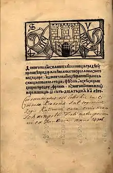 Schweipolt Fiol (also Sebald Vehl or Veyl; c. 1460 – 1525 or 1526) was a German-born 15th century pioneer of Cyrillic printing.[1][2] Fiol spent a considerable part of his life in Poland, particularly Kraków, the capital of the Polish Kingdom at the time. The city was famous for its university. The burgeoning of the arts and sciences contributed to the early emergence of book printing here: as early as 1473–1477 there was a print shop in Kraków, which published numerous theological works. The very first book printed in Cyrillic script, Oktoikh (Octoechos), was published by Fiol in 1491 in Kraków.[3]