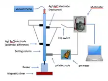 Sedimentation potential is measured by attaching electrodes to a glass column filled with the dispersion of interest. A voltmeter is attached to measure the potential generated from the suspension. To account for different geometries of the electrode, the column is typically rotated 180 degrees while measuring the potential. This difference in potential through rotation by 180 degrees is twice the sedimentation potential. The zeta potential can be determined through measurement by sedimentation potential, as the concentration, conductivity of the suspension, density of the particle, and potential difference are known. By rotating the column 180 degrees, drift and geometry differences of the column can be ignored.[9]
