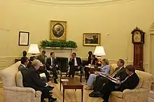 President Barack Obama meets with Vladimir Putin, Sergey Lavrov, Sergey Kislyak and other Russian representatives to discuss Syria and ISIL on September 29, 2015.