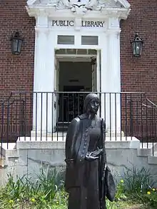 In front of the Sharon Public Library stands a statue of Deborah Sampson, Sharon's town heroine. Sampson disguised herself as a man to fight in the Revolutionary War. After the war, she married Benjamin Gannett, a farmer and lived in Sharon until the end of her life. Sampson began a campaign in 1790 to secure a pension from her time in the Revolutionary War, which earned the support of well known public figures, including Paul Revere. In 1804, Revere visited Sampson (then Sampson Gannett) at her farm in Sharon and wrote to the congressman of her district, William Eustis, that he found her "much more deserving than hundreds to whom Congress have been generous."[4] Sampson was placed on the United States pension list a year later, and awarded an annual payment. She is buried in the local Rock Ridge Cemetery. A street in Sharon is named Deborah Sampson Street in her honor. In 1983, the Massachusetts General Court designated Sampson as the official State Heroine of the Commonwealth of Massachusetts.[5]