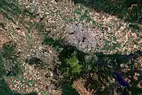 The population of Sofia declined from 70,000 in the late 18th century, through 19,000 in 1870, to 11,649 in 1878, after which it began increasing.[26] Sofia hosts some 1.24 million[10] residents within a territory of 492 km2,[27] a concentration of 17.9% of the country population within the 200th percentile of the country territory. The urban area of Sofia hosts some 1.54 million[28] residents within 5723 km2, which comprises Sofia City Province and parts of Sofia Province (Dragoman, Slivnitsa, Kostinbrod, Bozhurishte, Svoge, Elin Pelin, Gorna Malina, Ihtiman, Kostenets) and Pernik Province (Pernik, Radomir), representing 5.16% of the country territory.[7] The metropolitan area of Sofia is based upon one hour of car travel time, stretches internationally and includes Dimitrovgrad in Serbia.[29] The metropolitan region of Sofia is inhabited by a population of 1.66 million.[12]