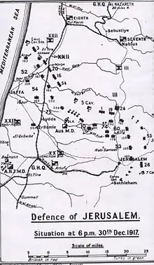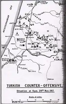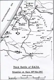 III Corps at Kauwukah or in XX Corps reserve near Kh. Jemmame east of Huj (24th Division) at Beersheba (27th, 16th Divisions, 3rd Cavalry Division) also at Beersheba.[22][47][48]