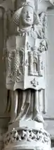 Left:Arms of Sir John Speke (died 1518) impaling Somester, arms of his 3rd wife Elizabeth Somester: Argent, a castle between three fleurs-de-lis sable (per Pole (died 1635)[16]), here shown as Or, a castle between five fleurs-de-lis sable. Above is the crest of Speke: A porcupine. Outside wall of Speke Chantry, Exeter Cathedral. Right: same arms displayed by a statuette of a crowned angel, within the chantry