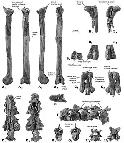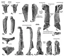 The holotype material consists of a partial postcranial skeleton, subcomplete left and right coracoid, subcomplete right scapula, a subcomplete left and right humerus, the left complete ulna, proximal and distal end of the right femur, the complete right and proximal end of the left tibiotarsus, the proximal end of the left fibula, the right complete tarsometatarsus, the cranial portion of the sternum with articular sulcus for coracoid and fragment of the craniolateral process, two fragmentary thoracic vertebrae from the caudal region, seven caudal vertebrae and a fragmentary synsacrum.[2]