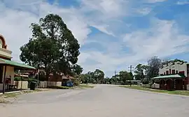 The main street of Springhurst, 2009. The post office is on the left, the Carriers Arms Hotel on the right