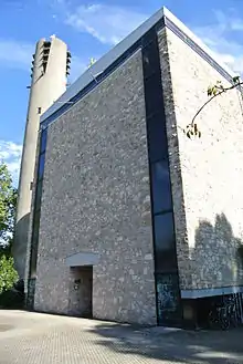 Johannes Krahn, who built several churches and early skyscrapers such as the Beehive House in Frankfurt am Main, designed a space recalling elements of an early Romanesque Basilica. In a simple shape, a single long nave is concluded by a semicircle choir around the altar. The outer walls are sandstone, visible both inside and outside.[1] Light flows in from bands of windows.[1] The combination of materials has been compared to Le Corbusier. The building recalls the austere style of sacred architecture of the 1950s.[1]