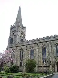 The earliest record of a church on the site is in 1122, when it was granted to Pontefract Priory.[2] The tower and east window of the present church date from the 15th century. The rest of the church was rebuilt by Thomas Rickman and Henry Hutchinson in 1828–29. In 1844 an additional stage and the spire were added to the tower.[3] The church was restored in 1881 by the Lancaster architects Paley and Austin.[4] In 1898 the timber roof and clerestory were added by Frederick Robinson.[3] In 1913, the west gallery was removed. This had contained the original organ made by Samuel Renn in 1834, which was moved elsewhere, possibly to Chester. The new organ, made by J. J. Binns, was sited at the east end of the church.[5] In 2008 a piece of the spire fell off and it was discovered that the spire was crumbling, and in 2010 an appeal was launched to raise money for its repair.[6]