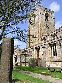 The church is constructed in millstone grit, with roofs of lead, slate, and stone slate. Its plan consists of a four bay nave with a clerestory, north and south aisles, both with side chapels, a south porch, a north hearse house, a two-bay chancel, and a west tower. The tower is in two stages, with diagonal buttresses.[2] Towards the top of the southeast tower are the carved coat of arms of Fountains Abbey. There are more coats of arms on the southwest buttress.[3] The tower contains a three-light west window, a trefoil-headed niche on the south side, clock faces on the east and west sides, and three-light bell openings on each side. At the summit of the tower is an embattled parapet.[2] The porch contains two consecration crosses.[3] Along the side of the south aisle, and in its west wall, are three-light windows. The south chapel is known as the Lady Chapel. This has a doorway on the west side and a three-light window on the east side. The north aisle contains two-light windows at the west end and along the sides, a blocked entrance and a hearse house. The north chapel is dedicated to Saint John the Baptist. It has a three-light east window. The windows on the south of the clerestory have three-light windows, and the windows on the north side have two-lights. The parapet of both clerestories is embattled. In the east wall of the chancel is a five-light window.[2]