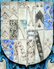 The memorial has suffered much neglect, and been whitewashed several times. Little colouring remains, which makes identification of the armorials difficult. The relief sculpture is well executed and clear.[2] The small kneeling effigy of Joan appears twice on the monument, kneeling behind each husband. According to the local historian Ronald Branscombe, this is "a double appearance thought to be unique in British memorial art of this period".[3]