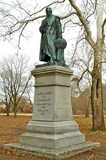 Alexander von Humboldt was a Prussian polymath active during the late 18th and early 19th centuries.[1] In May 1804, on the last stage of his scientific journey through the Americas, he visited Philadelphia.[2] On September 13, 1869, on the centennial anniversary of Humboldt's birth, the cornerstone for a monument honoring him was laid in Fairmount Park, on a knoll overlooking the Girard Avenue Bridge, by the city's German society.[3] The statue on Humboldt was designed by Friedrich Drake, a German sculptor based in Berlin.[4] It was dedicated in 1871.[5] Several years later, in 1876, on the centennial of American independence, the statue was gifted to the city of Philadelphia and dedicated again.[6] According to the Association for Public Art, the statue was moved to another part of the park in 1977.