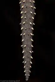 The species can be distinguished from similar looking Strophurus from the rows of enlarged projections along the back of the tail.[8] These projections, otherwise known as tubercles, occur in four longitudinal rows along the back of the tail and are orange in colour. Studies conducted by Eric Pianka depict that the tails of eastern spiny-tailed geckos have evolved to obtain antipredator functions and are also commonly used in behavioural displays.[9] The caudal glands are able to project thin streams of a sticky, noxious and odorous substance through the skin ruptures of the mid-dorsal line of the tail. These defence secretions (composed of protein and glycoprotein) can be aimed at a predator by the curving of the tail. It has been found that this caudal-gland ejection (the ejection of a sticky defensive secretion from the tail) has a direct link with lower rates of tail loss in S. williamsi. This may also be due to the elaboration of tubercles surrounding the caudal glands as many other species of gecko rely solely on autotomy to escape predators.[4]