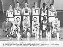 In 1946, Italian immigrant Danny Biasone sent a $5,000 check to the National Basketball League offices in Chicago, and the Syracuse Nationals became the largely Midwest-based league's easternmost team, based in the upstate New York city of Syracuse.[2] The Syracuse Nationals began to play in the NBL in the same year professional basketball was finally gaining some legitimacy with the rival Basketball Association of America that was based in large cities like New York and Philadelphia. While in the NBL with teams largely consisting of small Midwestern towns, the Nationals put together a 21–23 record, finishing in 4th place. In the playoffs, the Nats would be beaten by the fellow upstate neighbor Rochester Royals in 4 games.