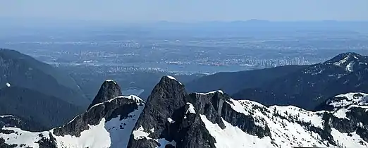The Lions, known as Ch'ích'iyúy Elx̱wíḵn ("The Twin Sisters") in the Sḵwx̱wú7mesh (Squamish) language, are a pair of pointed peaks (West Lion – 1,646 m (5,400 ft);[1] East Lion – 1,606 m (5,269 ft))[2] along the North Shore Mountains in Metro Vancouver, British Columbia, Canada. They can be seen from much of the Greater Vancouver area, as far as Robert Burnaby Park in East Burnaby, south to parts of Surrey, and from the west on the Howe Sound Islands and the Sunshine Coast. Along with the Lions Gate Bridge named in their honour, these twin summits have become one of the most recognizable Vancouver landmarks. The city's BC Lions CFL football team is also named in their honour. Lions Gate Entertainment which was founded in Vancouver in July, 1997 is also named for the peaks.